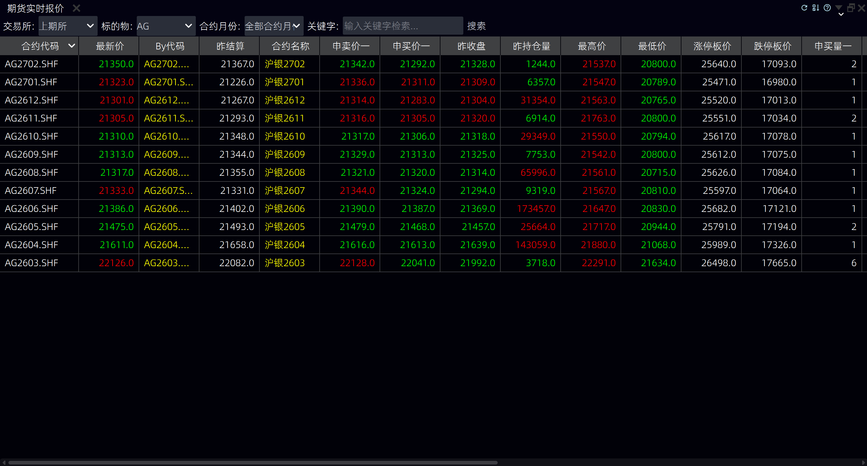 查看报价信息 - 查看期货合约的最新价、涨跌幅、成交量、成交额等信息 - 查看期货合约的开盘价、最高价、最低价、昨收价等信息 - 查看期货合约的买卖盘口信息