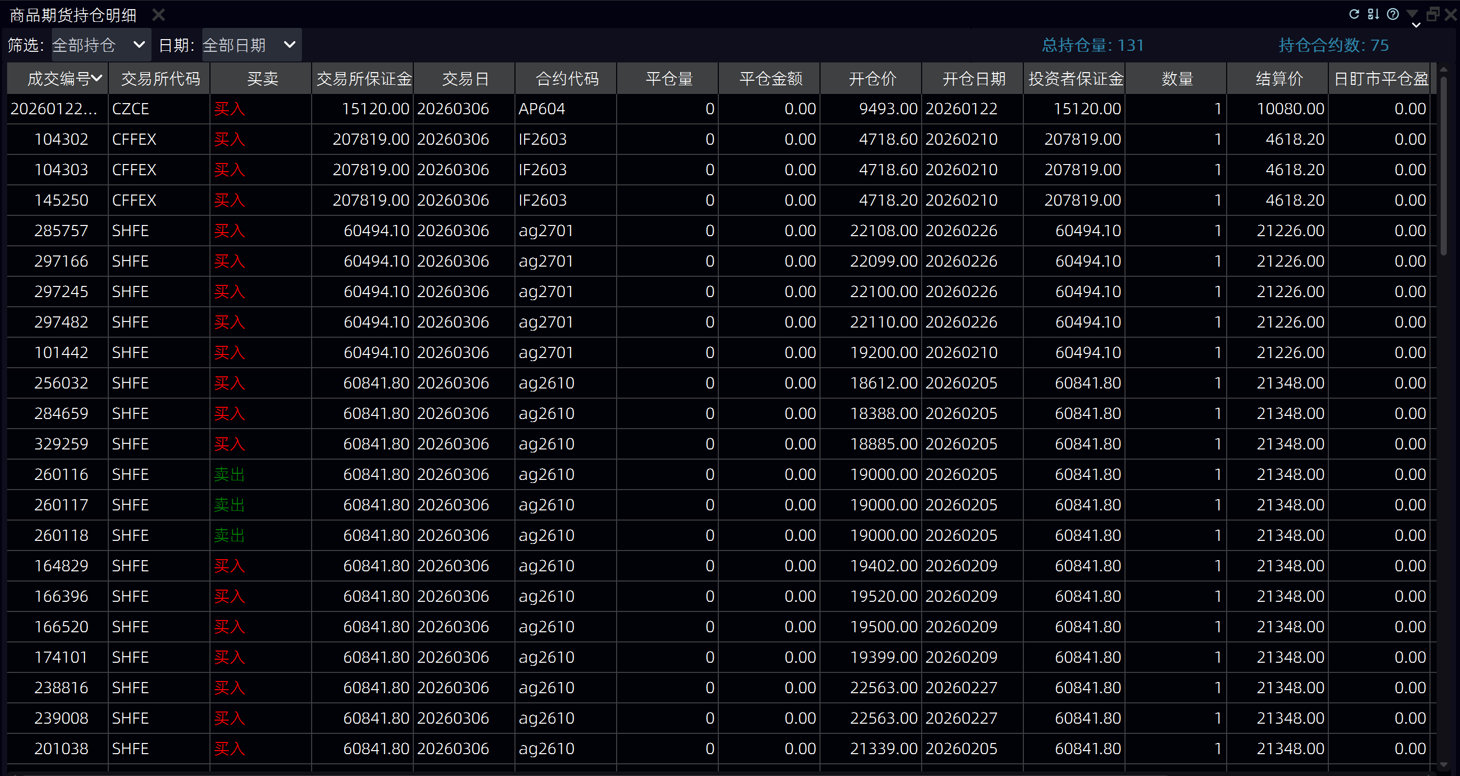 功能说明:查看商品期货的持仓明细,包括每笔持仓的详细信息。