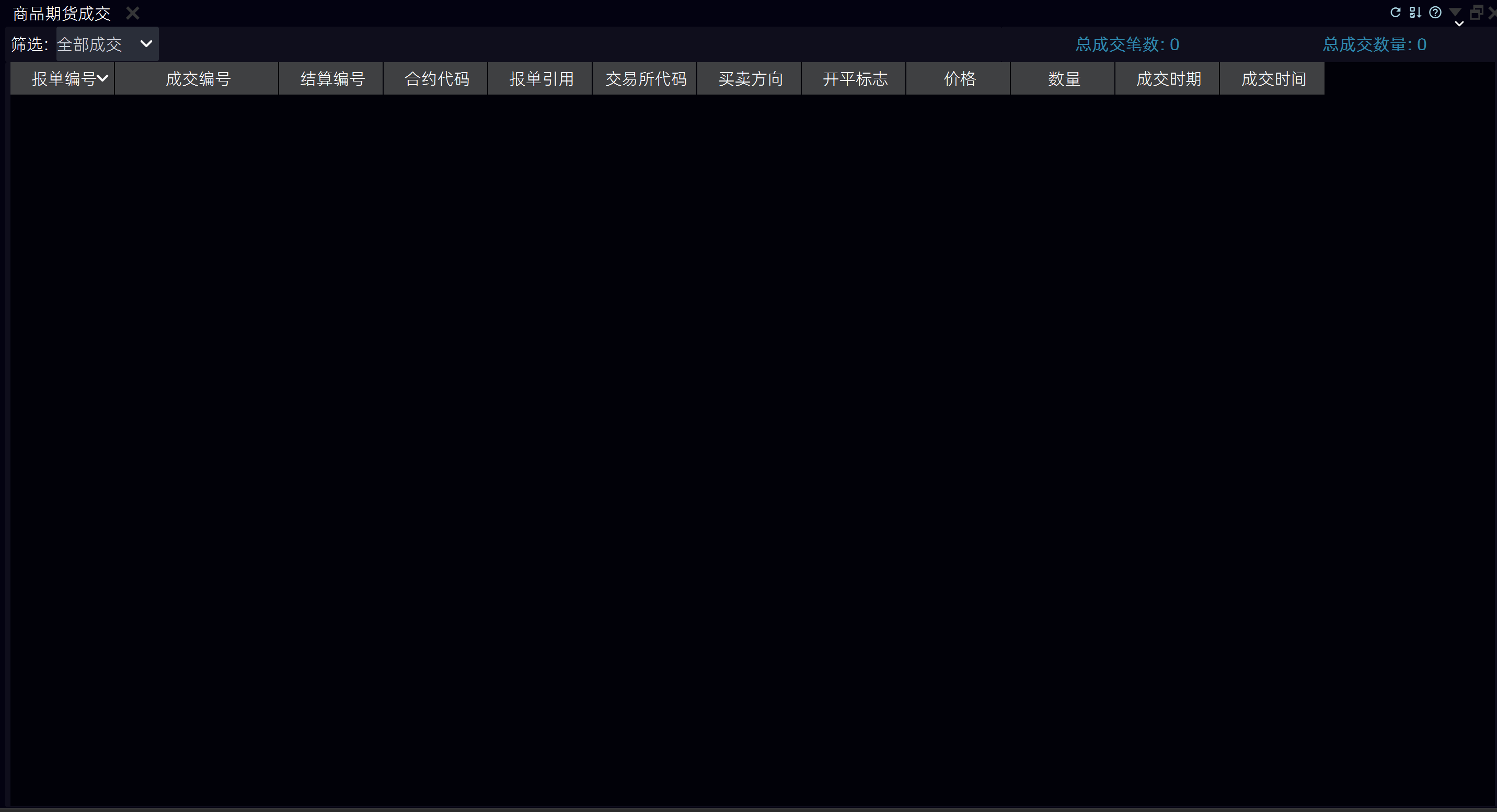 打开商品期货成交 - 点击菜单栏中的 "交易" -> "商品期货成交" - 或在工作区中选择 "商品期货成交" 标签页
